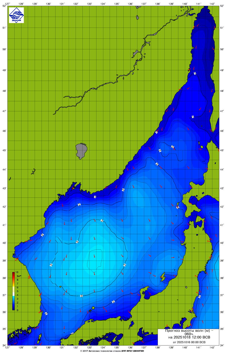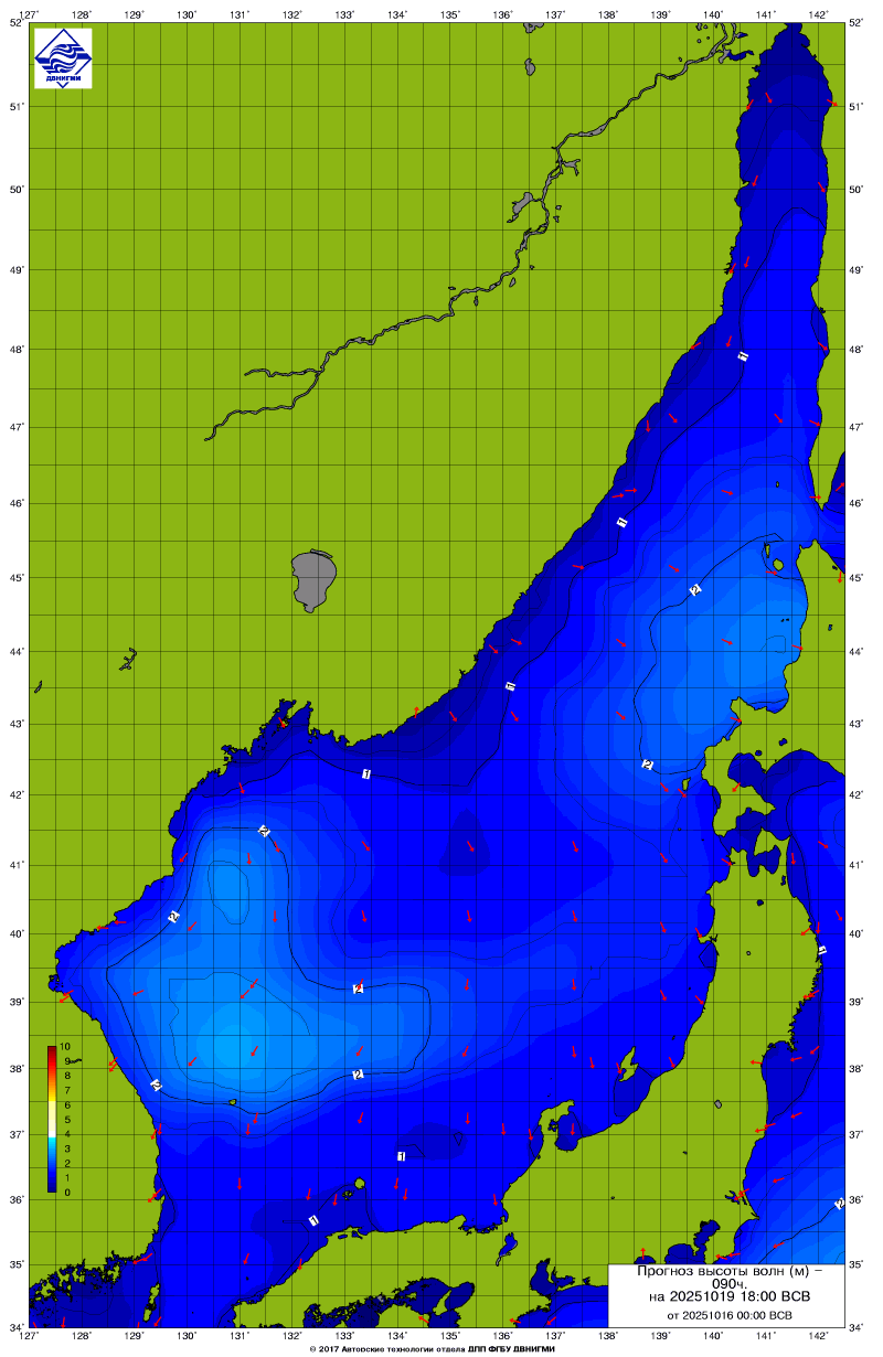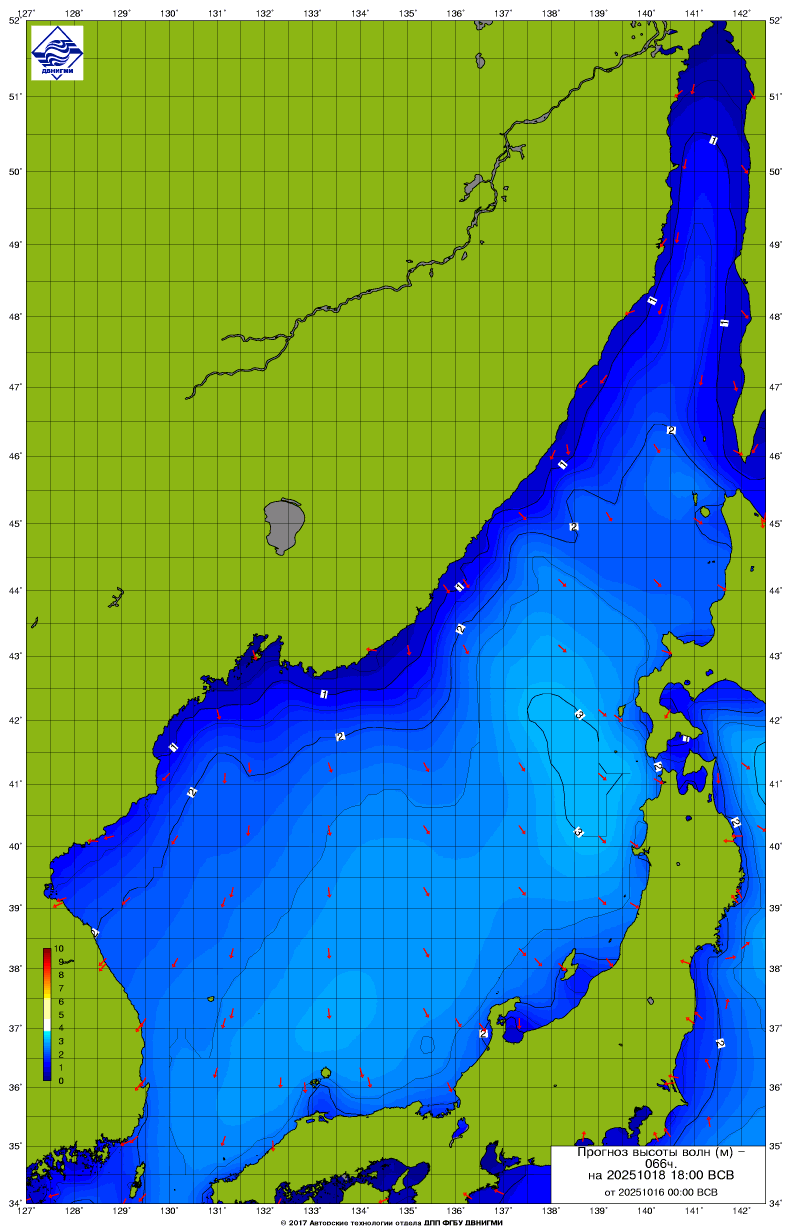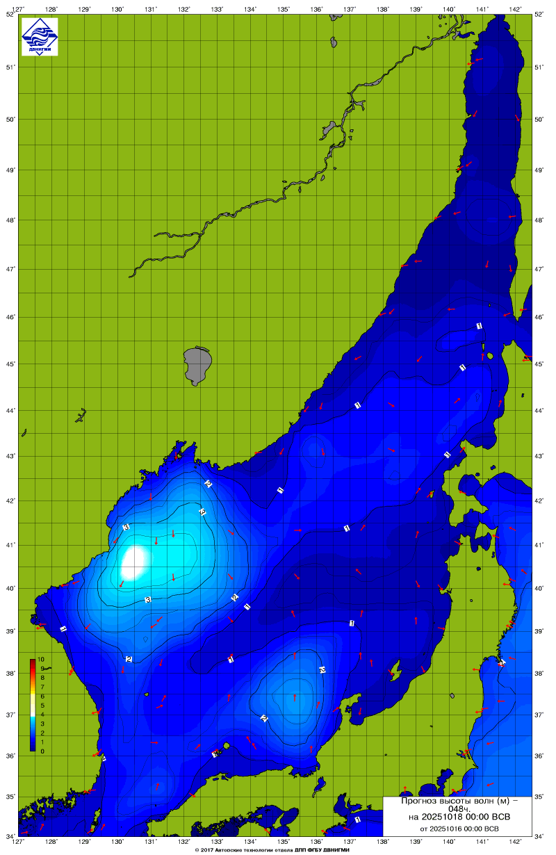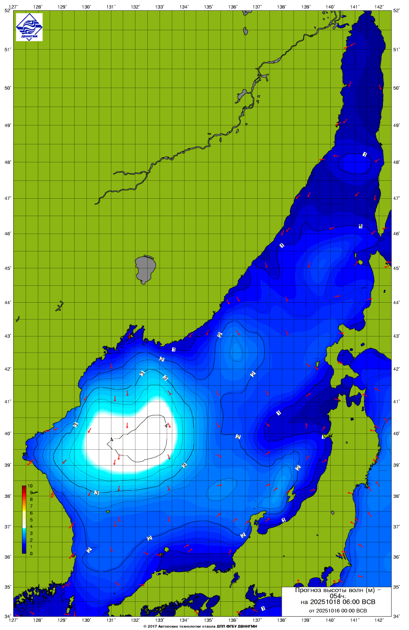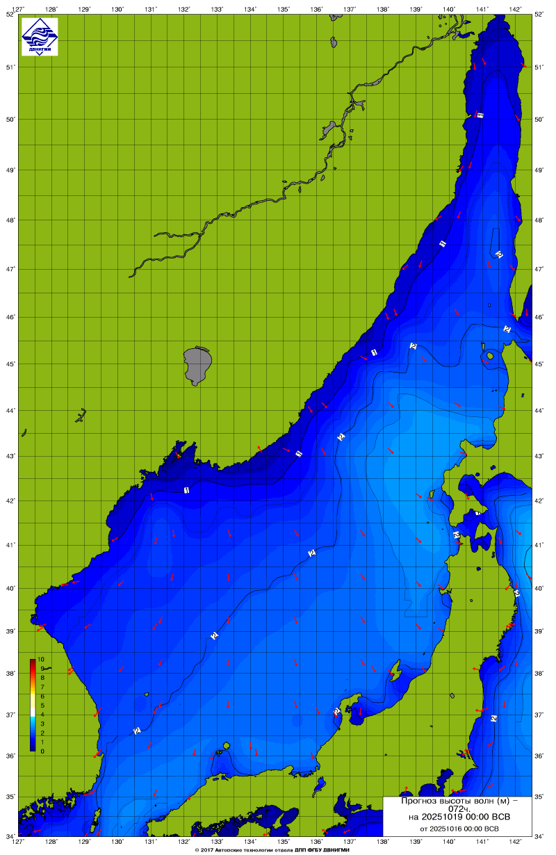 Прогноз на основе численной модели WW III является результатом научных исследований, проводящихся в ФГБУ "ДВНИГМИ".