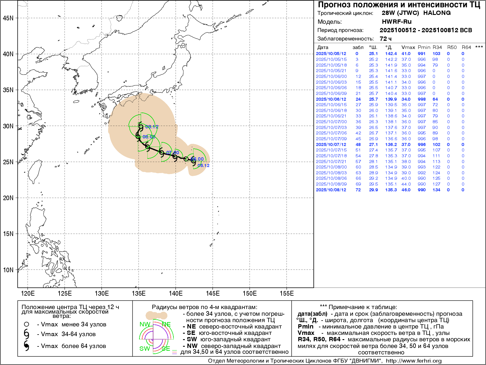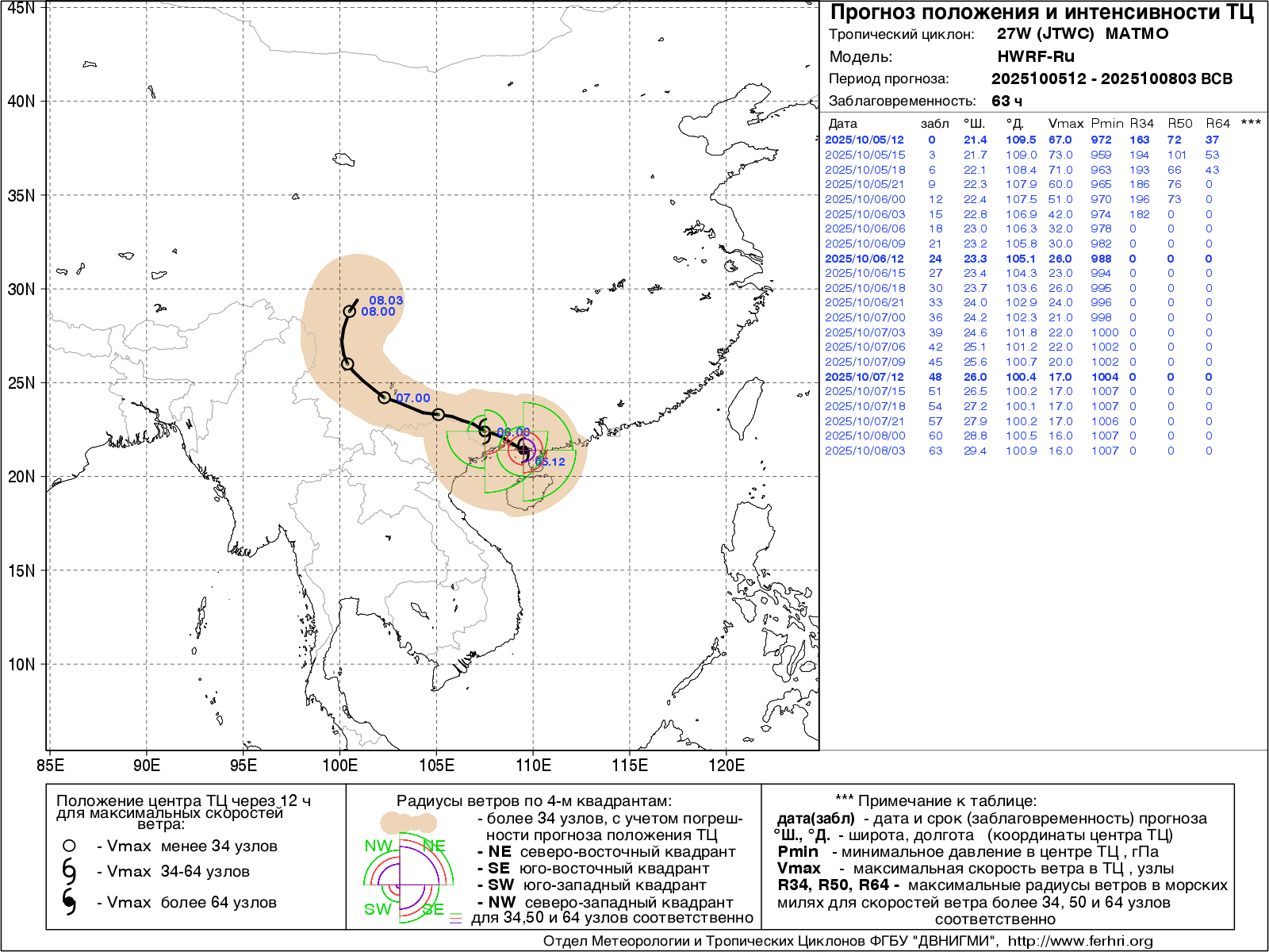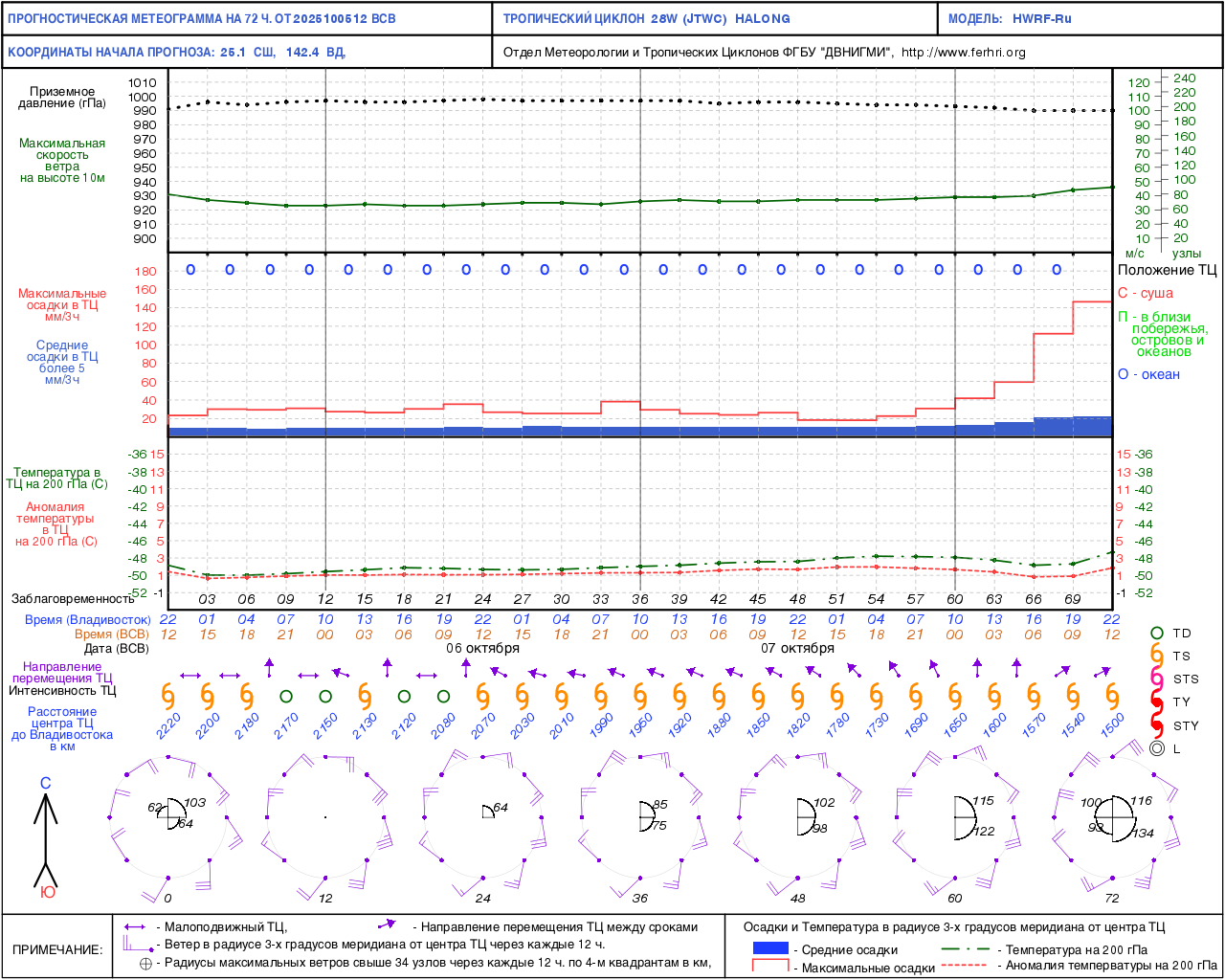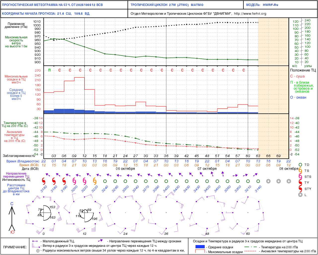 Данная продукция представлена численными прогнозами положения и интенсивности тайфунов по модели WRF. Согласно решению ЦМКП Росгидромета от 20 июня 2017 г. автоматизированный метод краткосрочного (с заблаговременностью до 72 часов) прогноза положения тропических циклонов рекомендован в качестве основного - для практического применения в оперативно-прогностической работе дальневосточных территориальных управлений Росгидромета. Прогноз интенсивности тропических циклонов имеет статус консультативного.