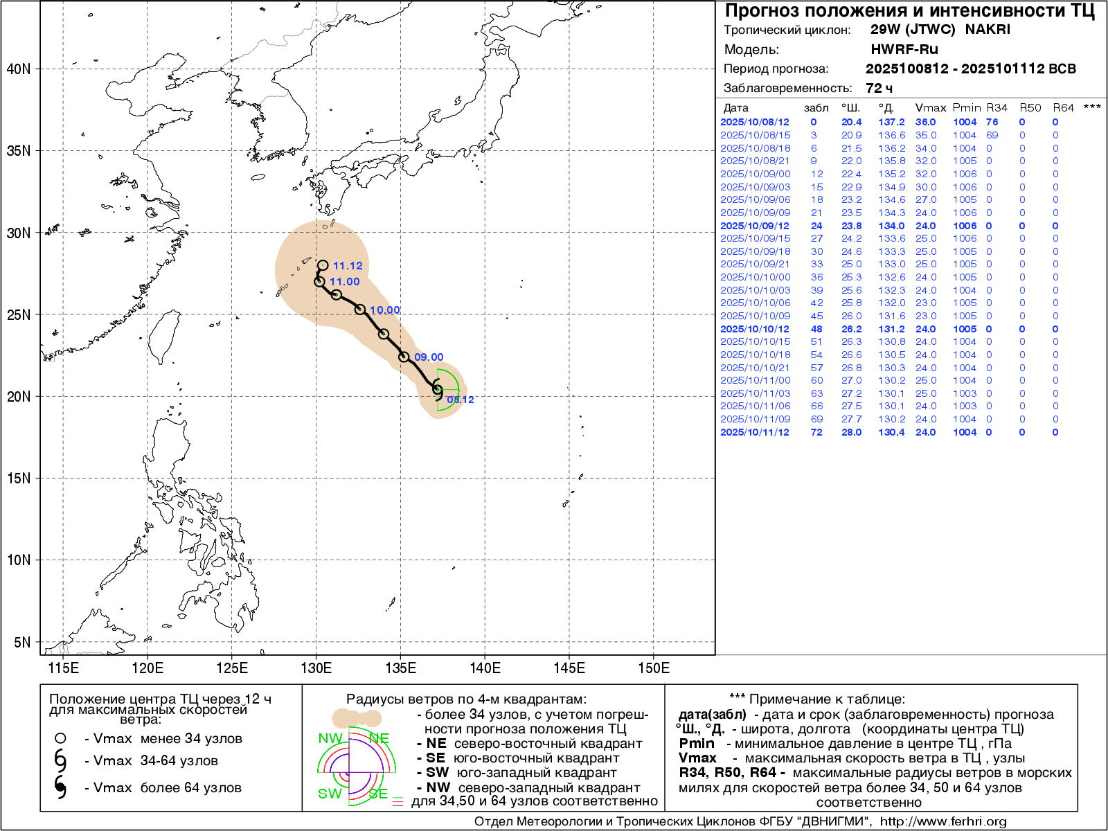 Данная продукция представлена численными прогнозами положения и интенсивности тайфунов по модели WRF. Согласно решению ЦМКП Росгидромета от 20 июня 2017 г. автоматизированный метод краткосрочного (с заблаговременностью до 72 часов) прогноза положения тропических циклонов рекомендован в качестве основного - для практического применения в оперативно-прогностической работе дальневосточных территориальных управлений Росгидромета. Прогноз интенсивности тропических циклонов имеет статус консультативного.