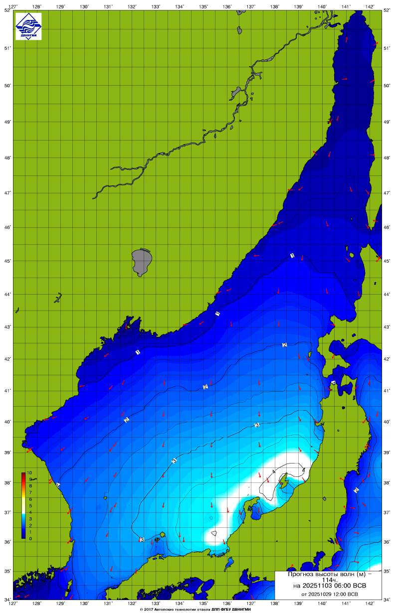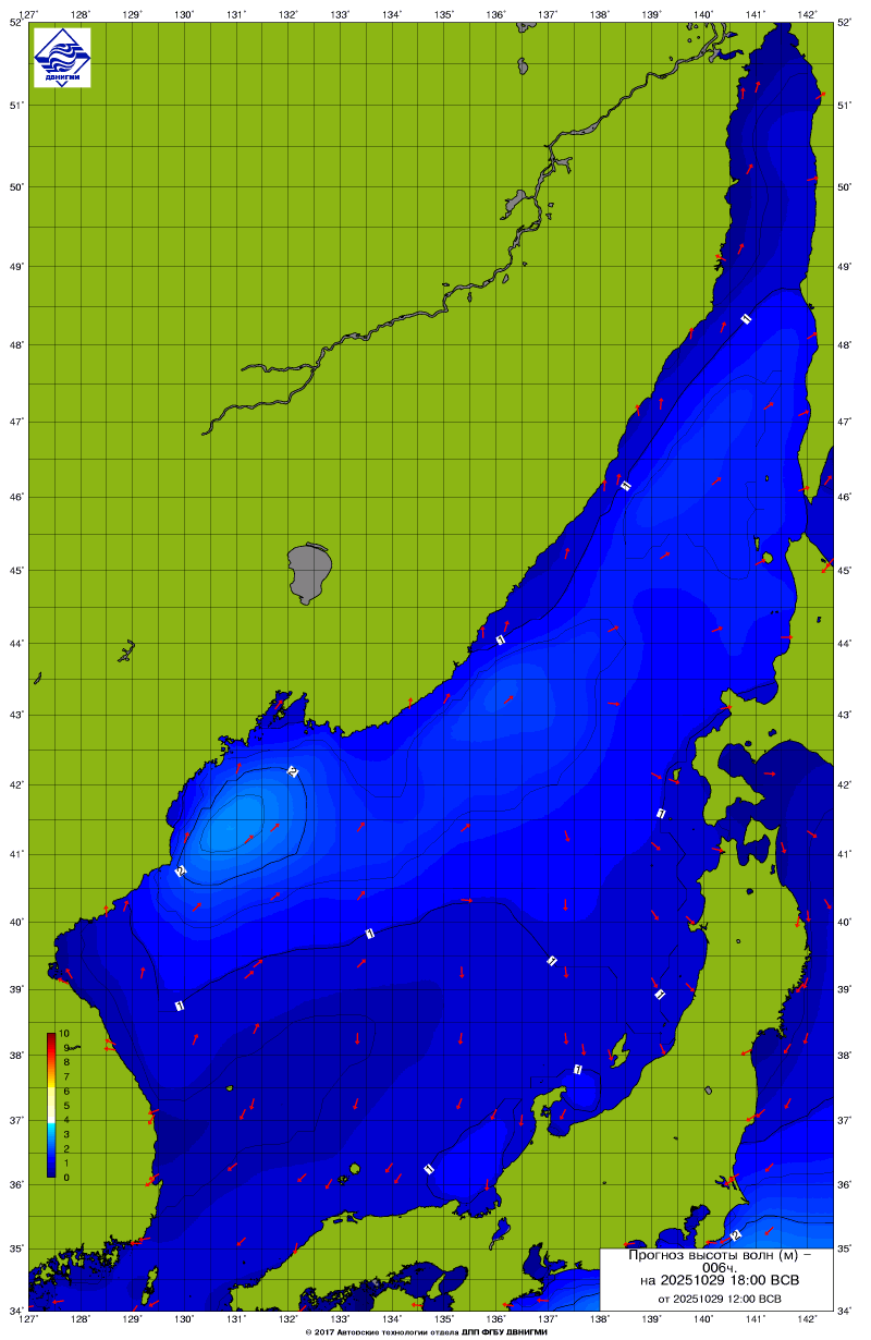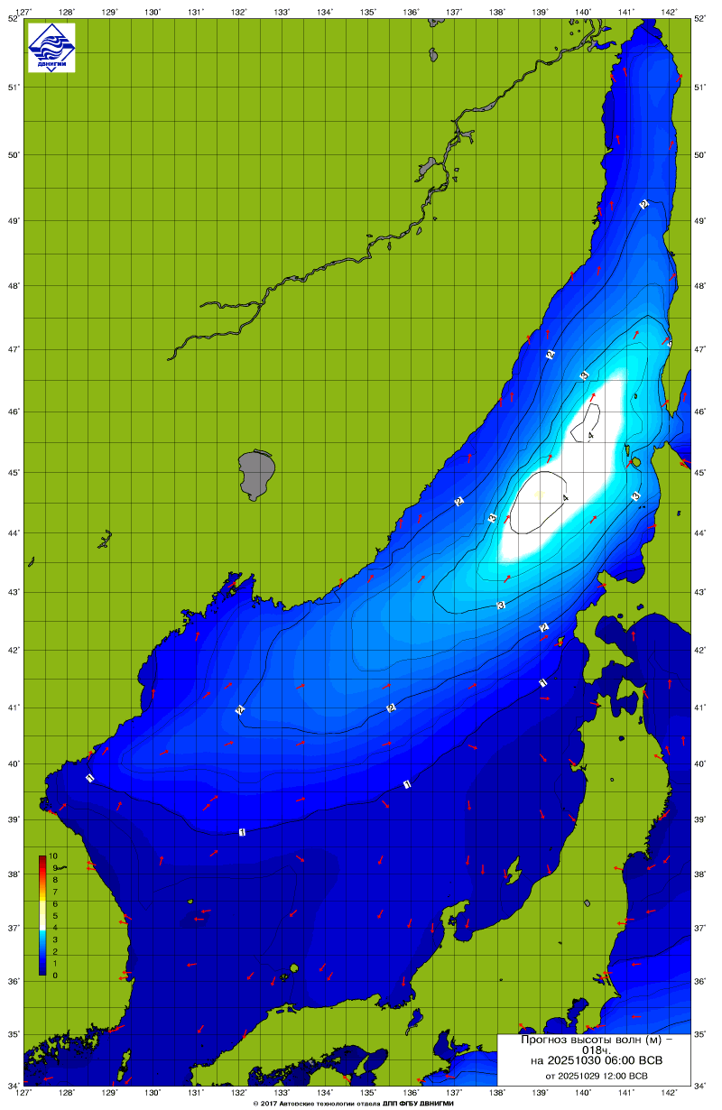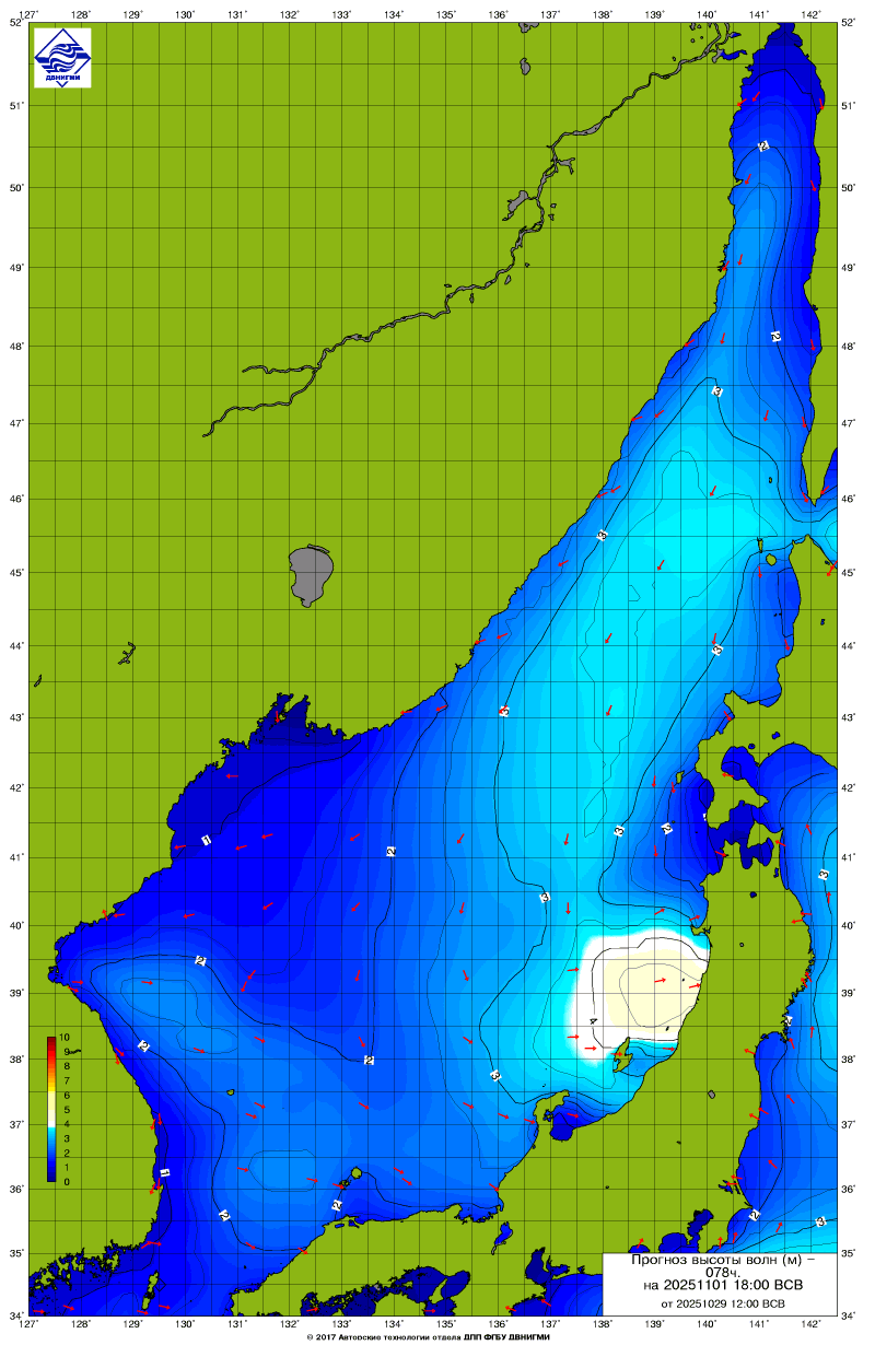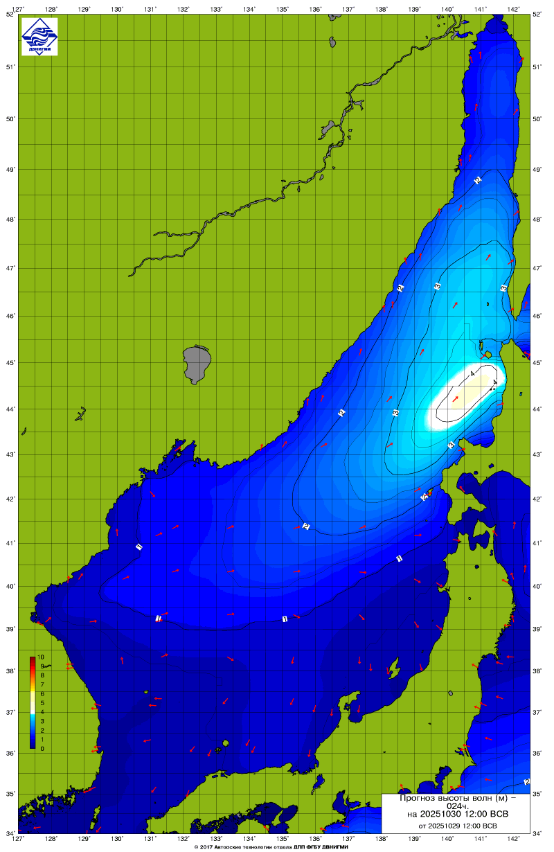 Прогноз на основе численной модели WW III является результатом научных исследований, проводящихся в ФГБУ "ДВНИГМИ".
