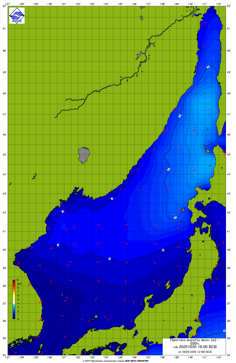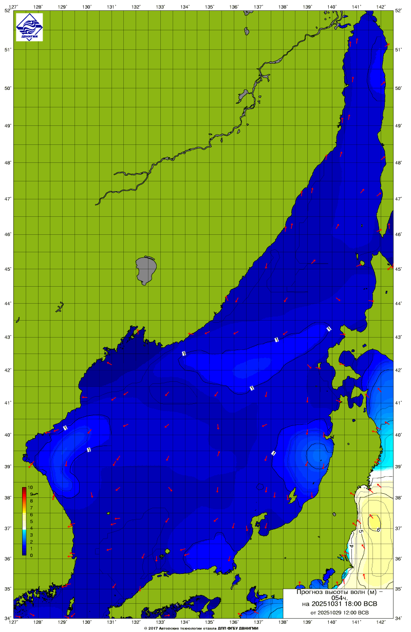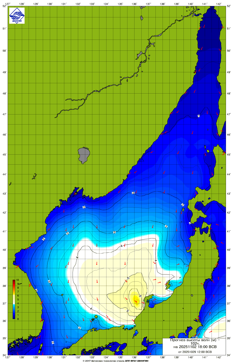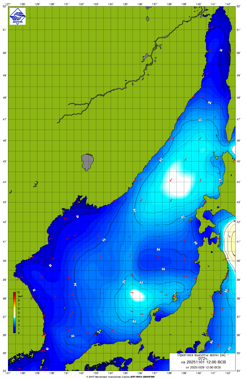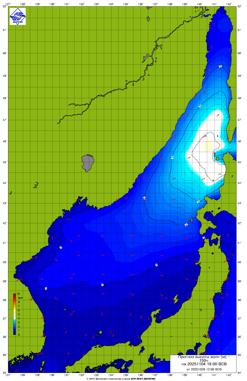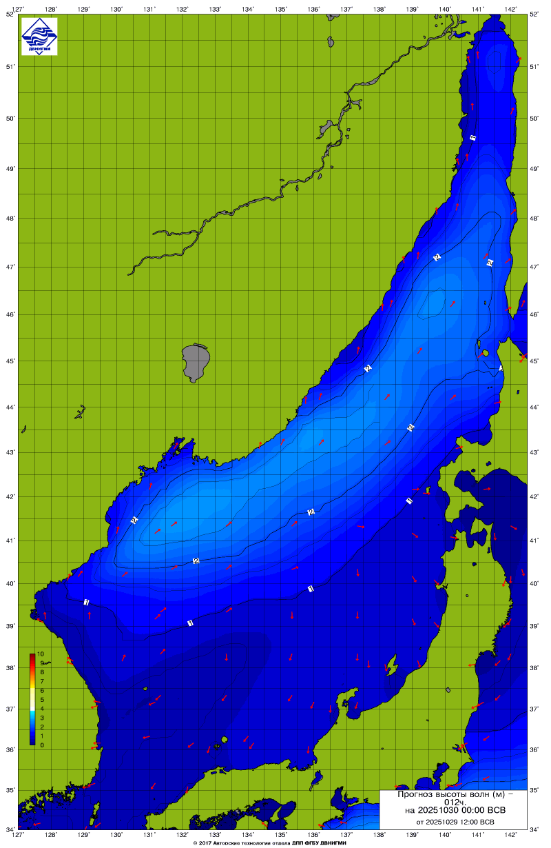 Прогноз на основе численной модели WW III является результатом научных исследований, проводящихся в ФГБУ "ДВНИГМИ".