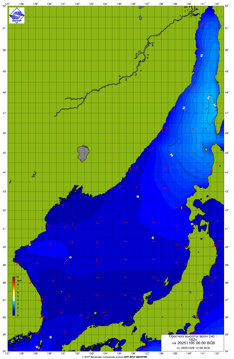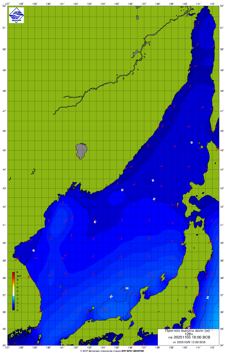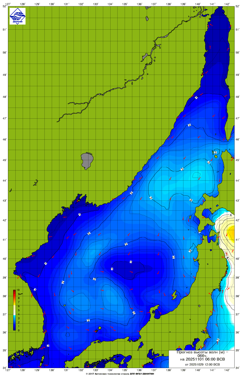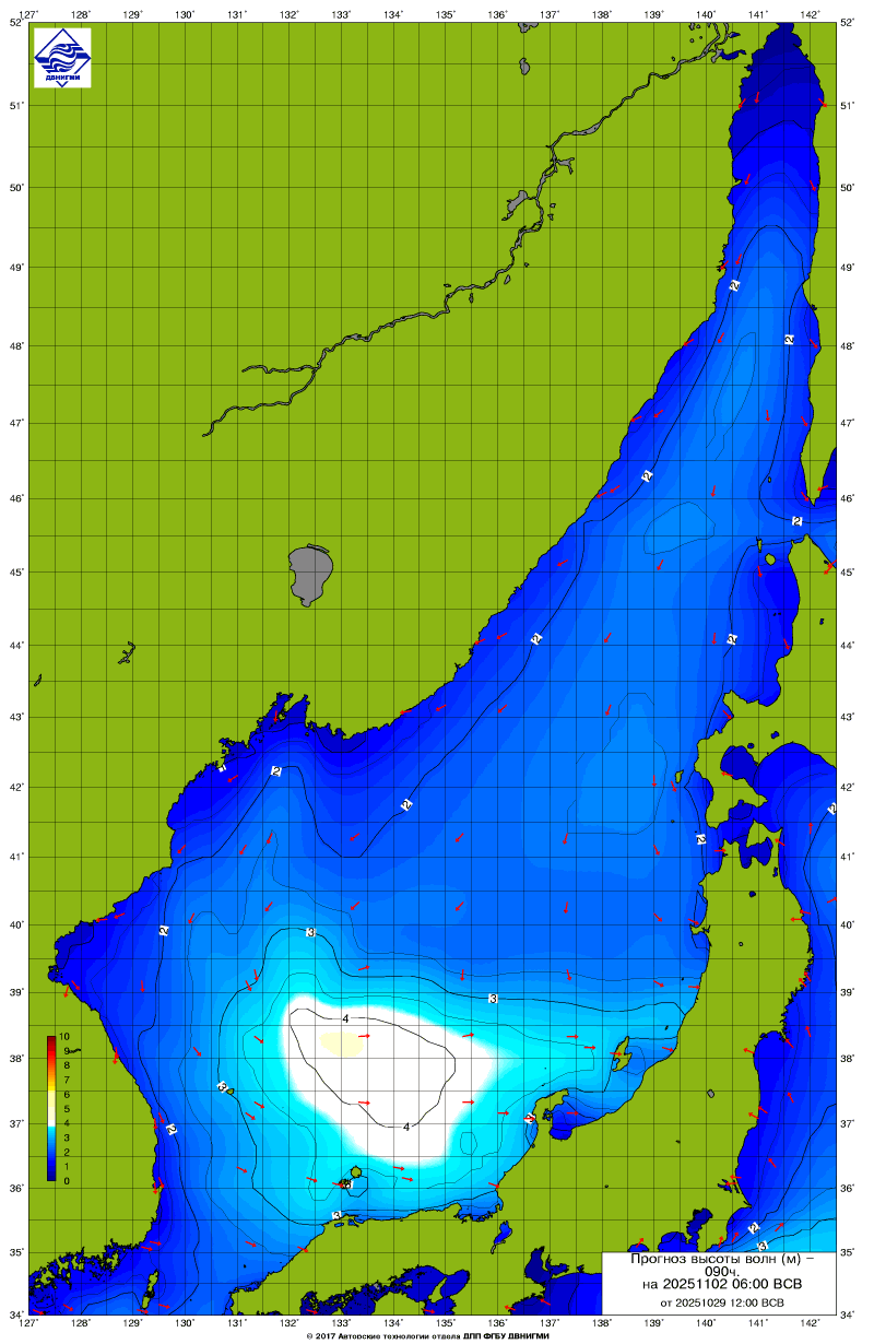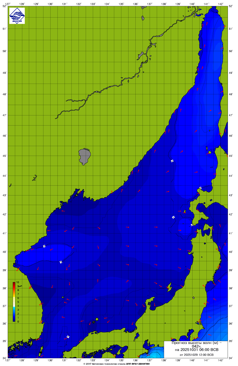 Прогноз на основе численной модели WW III является результатом научных исследований, проводящихся в ФГБУ "ДВНИГМИ".