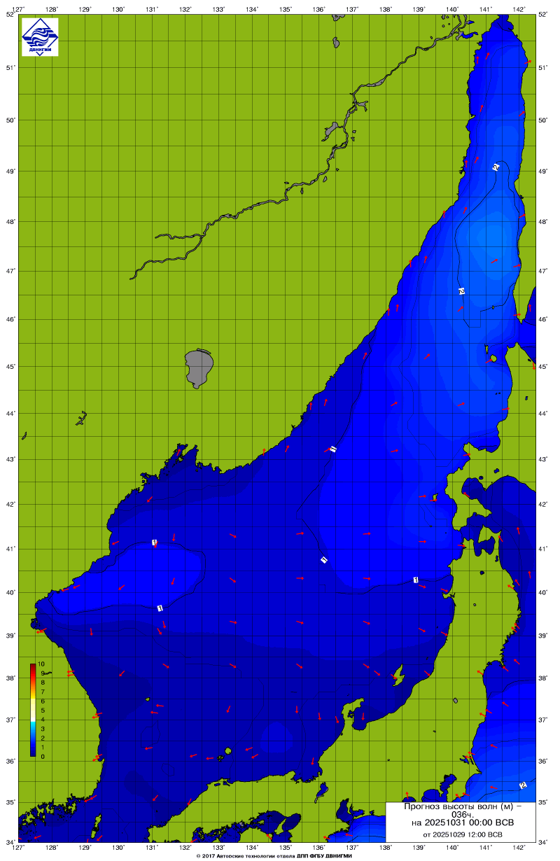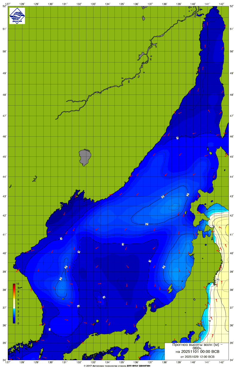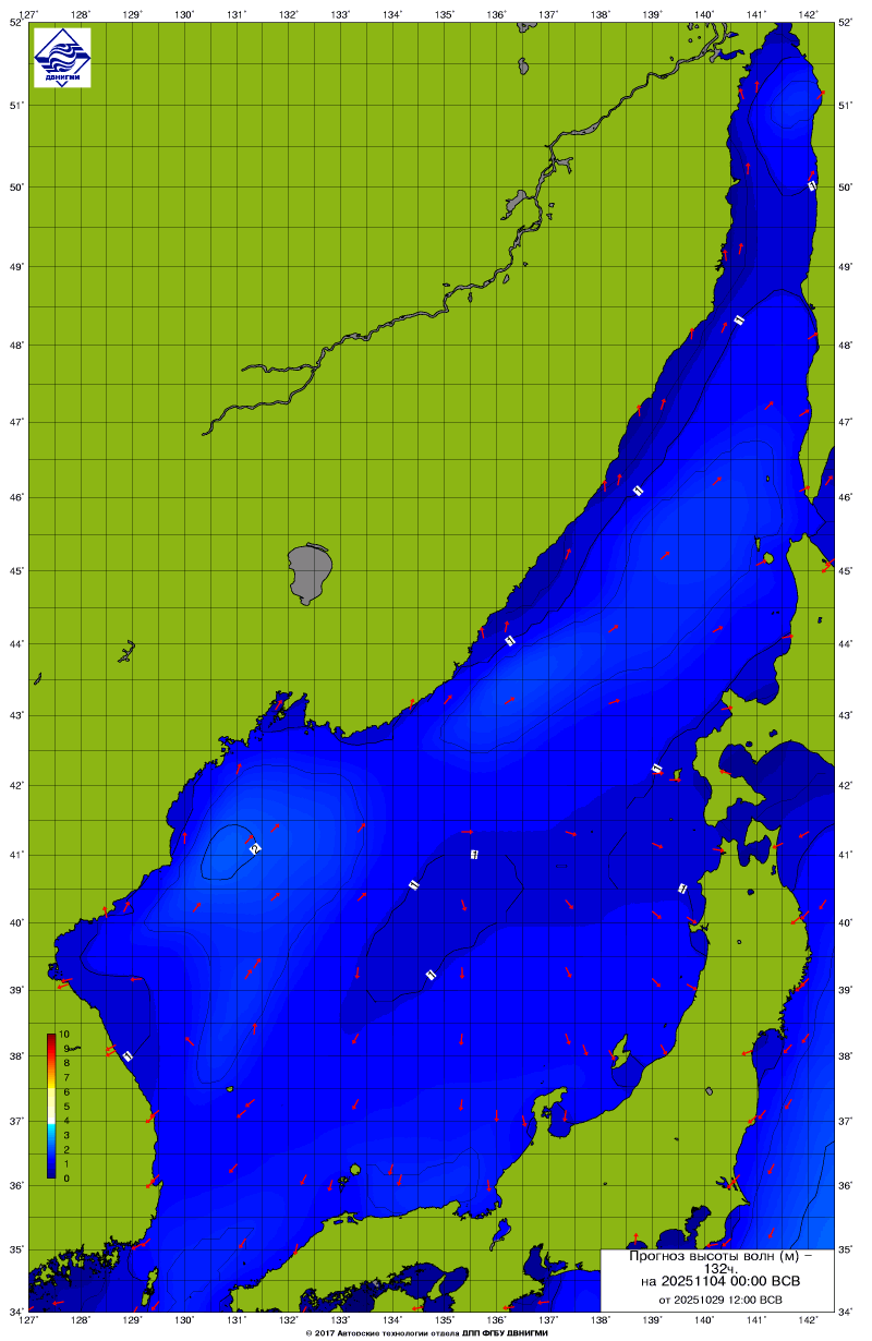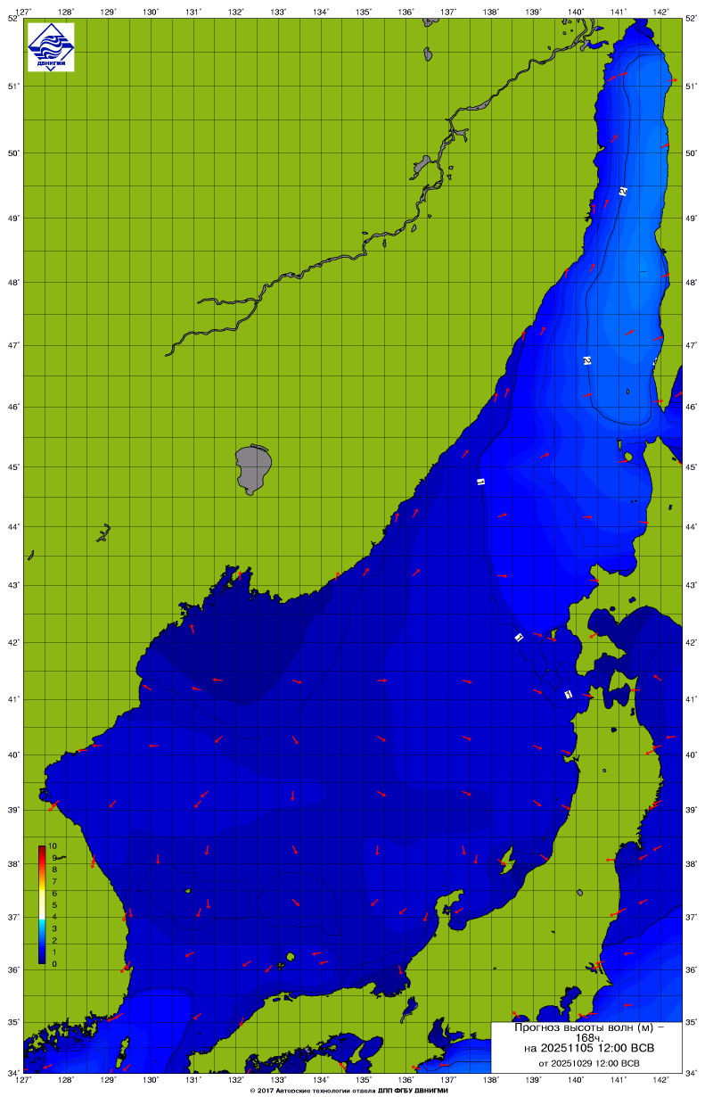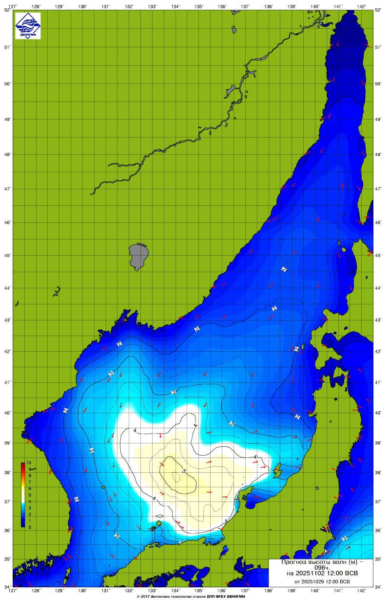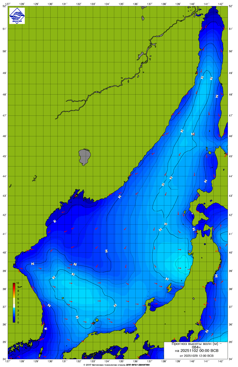 Прогноз на основе численной модели WW III является результатом научных исследований, проводящихся в ФГБУ "ДВНИГМИ".