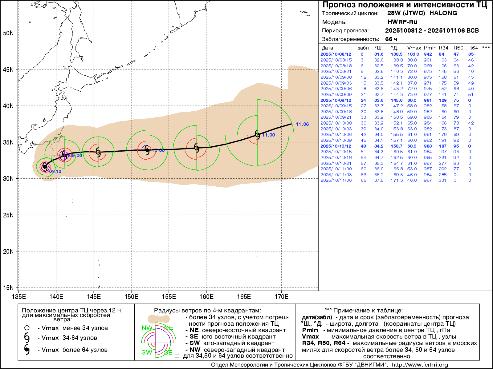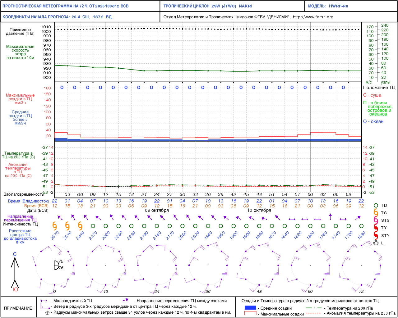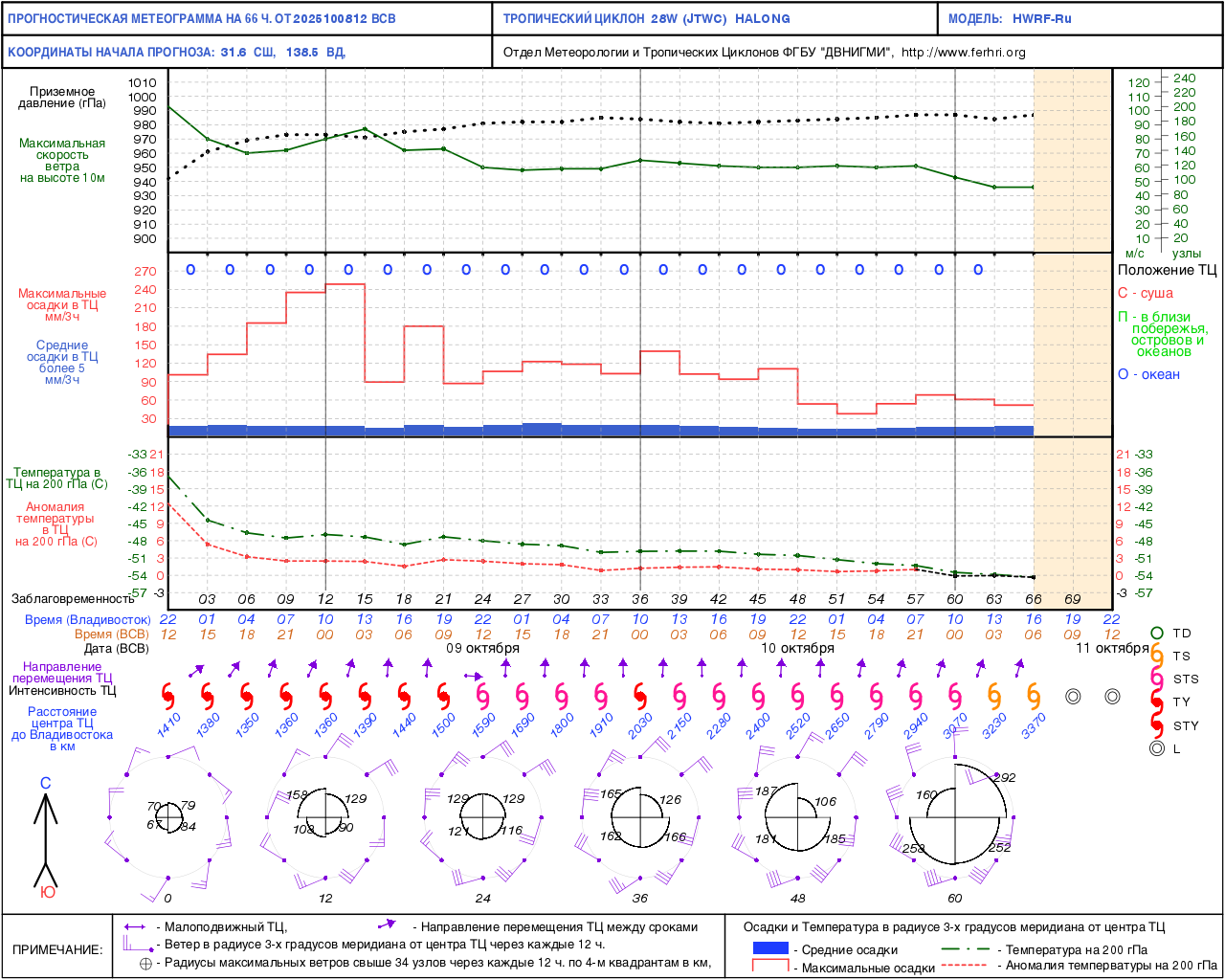 Данная продукция представлена численными прогнозами положения и интенсивности тайфунов по модели WRF. Согласно решению ЦМКП Росгидромета от 20 июня 2017 г. автоматизированный метод краткосрочного (с заблаговременностью до 72 часов) прогноза положения тропических циклонов рекомендован в качестве основного - для практического применения в оперативно-прогностической работе дальневосточных территориальных управлений Росгидромета. Прогноз интенсивности тропических циклонов имеет статус консультативного.