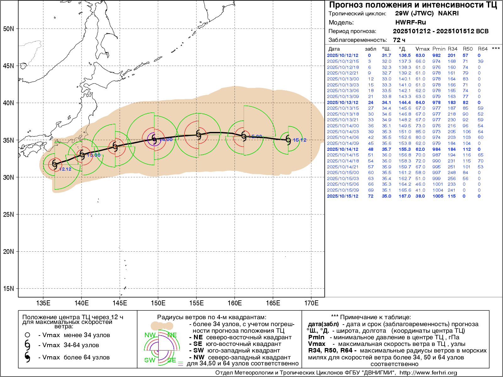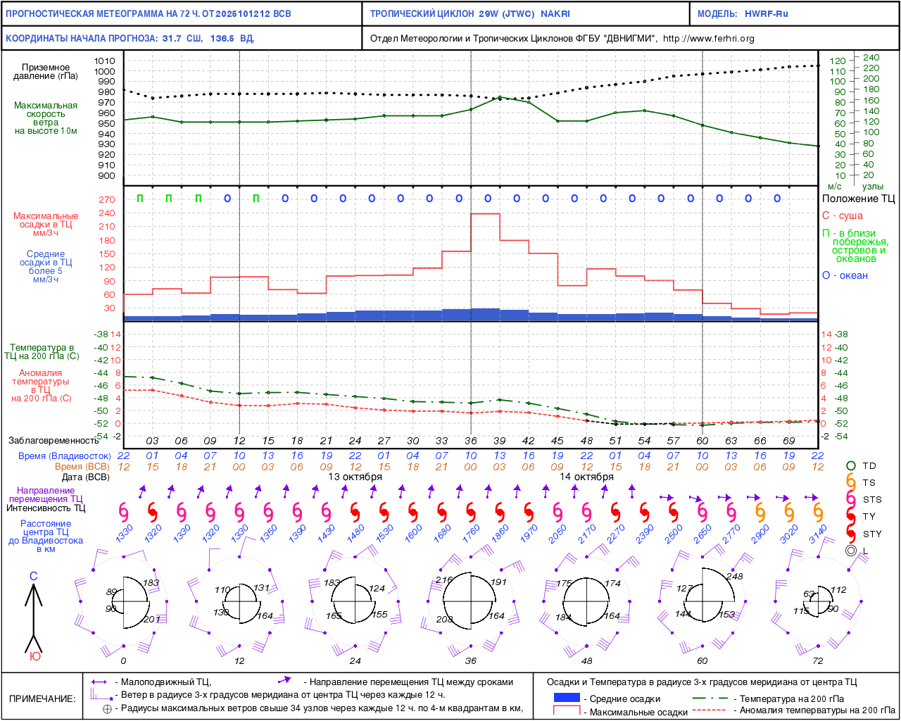 Данная продукция представлена численными прогнозами положения и интенсивности тайфунов по модели WRF. Согласно решению ЦМКП Росгидромета от 20 июня 2017 г. автоматизированный метод краткосрочного (с заблаговременностью до 72 часов) прогноза положения тропических циклонов рекомендован в качестве основного - для практического применения в оперативно-прогностической работе дальневосточных территориальных управлений Росгидромета. Прогноз интенсивности тропических циклонов имеет статус консультативного.